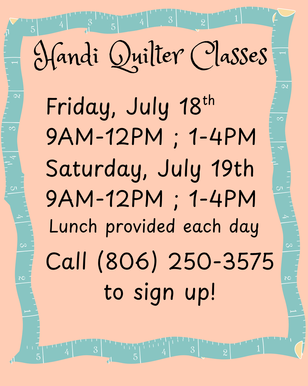 Simple to operate and full of great features, Handi Quilter Longarm machines are the affordable choice and are perfect for your home studio. Come take a test drive on one of these fabulous machines. Lunch will be provided each day.